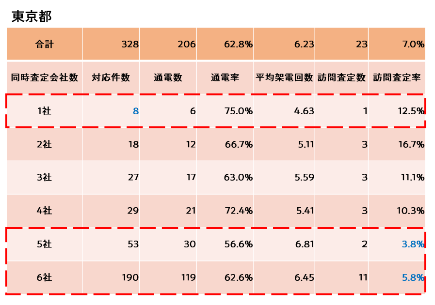 東京都とは異なり、同時査定社数が増えると訪問査定に繋がりにくいという傾向はないようですね。