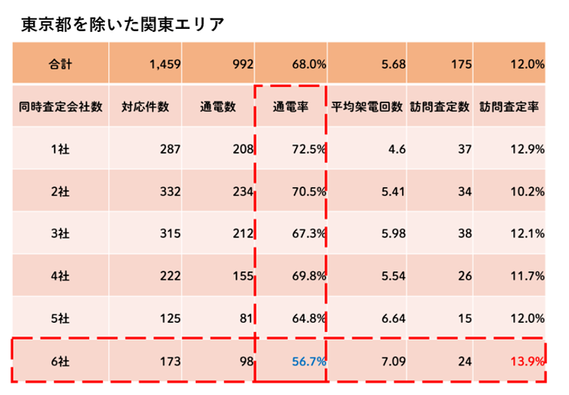 次に東京都を除く関東エリアの結果について、東京都と比較して同時査定社数毎に訪問査定率は大きく変わらず、