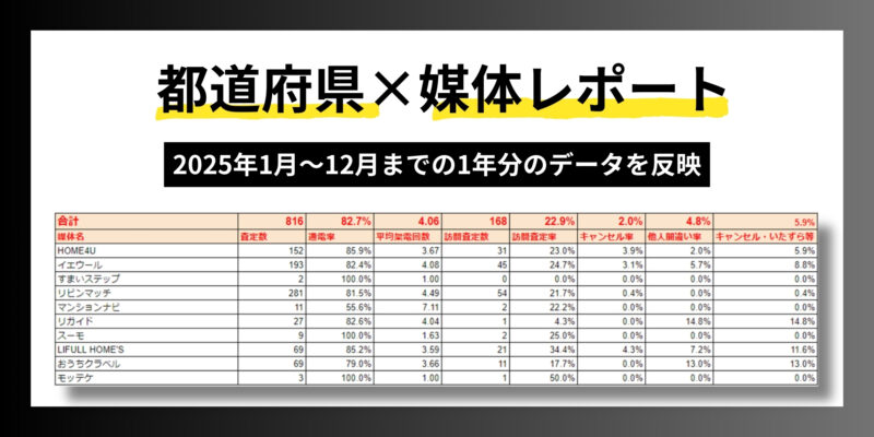 一括査定・売主集客【都道府県別】一括査定「売却率×媒体」レポートを公開【全9項目】本レポートでは、登記簿謄本をもとに「どの媒体から、どれくらい売却に至っているのか」を可視化しました。 どの媒体が売却につ