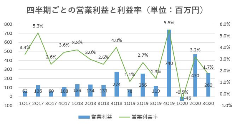 四半期ごとの営業利益は次のように2020期1Qは、上記同様の原因で減少しますが、2Qおよび4Qに利益計上できる見込みであることが「2020.10 1Q決算説明資料」にて説明されています。