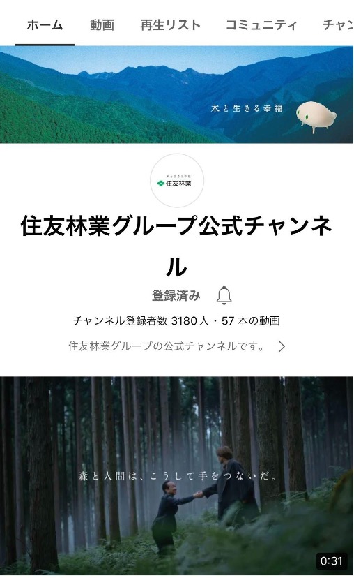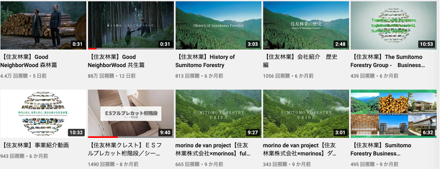 企業CM・広報動画や採用のための動画をメインに他には技術に関する説明動画や木、森に関する動画を毎月1本ほど投稿しています。