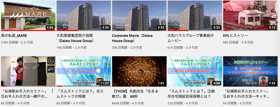 企業CMや事例紹介の動画をメインに投稿しています。9アカウントの中では最も投稿数が多いのがダイワハウスです。