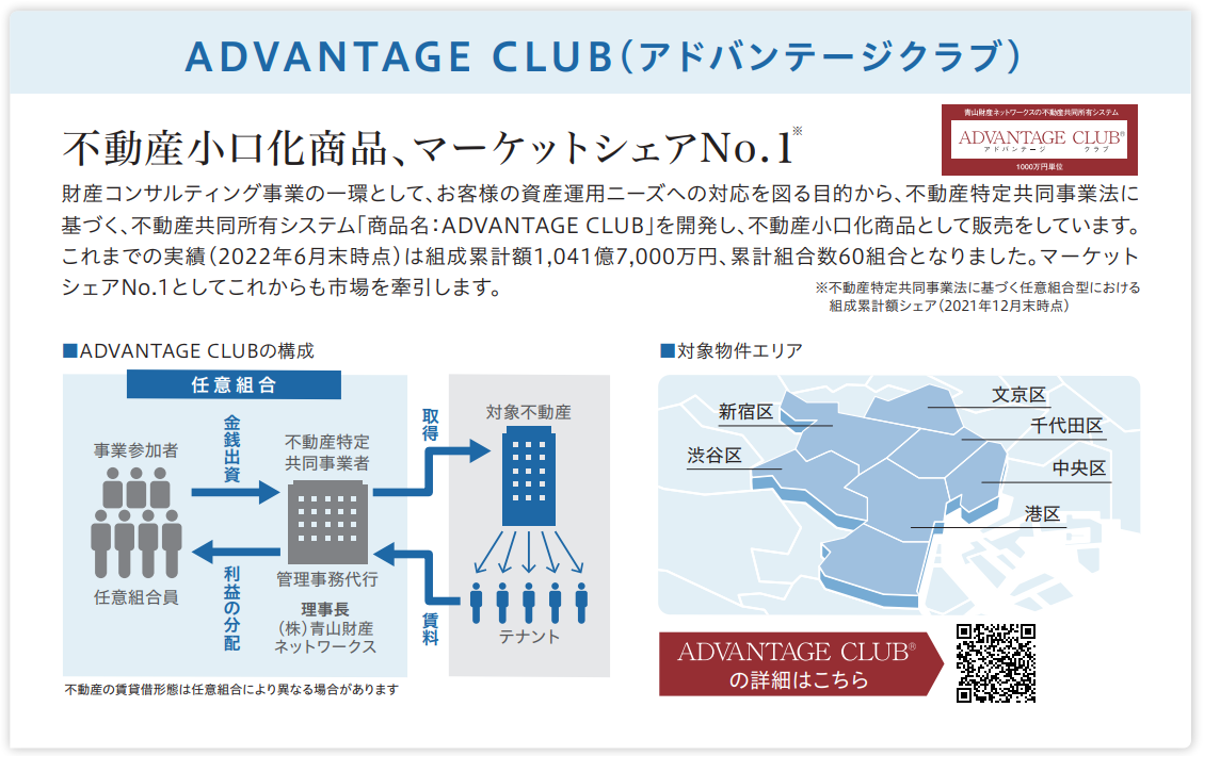 なかでも業界シェア6割を誇る「アドバンテージクラブ」という不動産小口化商品は青山財産ネットワークスの主要な商品のひとつです。