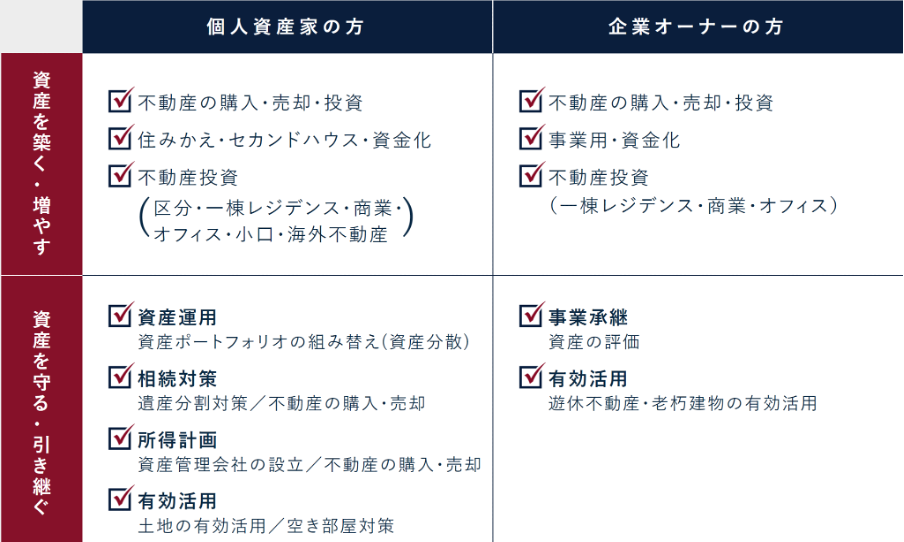 富裕層はリスクヘッジのためにあらゆる形で資産を持っており、金融資産なら金融サービスを行っている信託銀行などに相談すればよいですが、”不動産”という形の資産の場合、専門的な知識も必要であることなどから、安心して相談できる窓口が求められています。