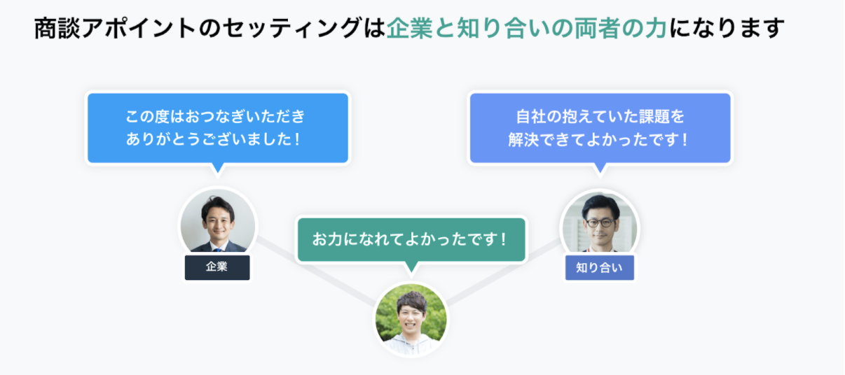 顧客側としても、信頼のある人からサービスを提案してもらったほうが承諾しやすく、企業側としても成約率が高いので、アポを取ってもらうだけでもメリットを享受できます。