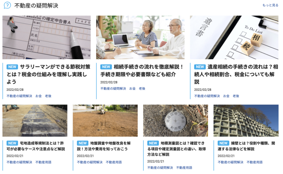webサイトのファーストビューに「不動産の疑問解決」というメニューがあることからも分かるように、多くの人が抱える悩みに対する記事コンテンツが豊富にあります。