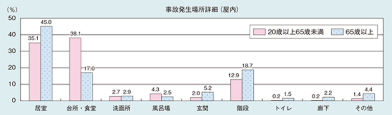 自宅内で起こる家庭内事故のうち、65歳以上の事故が多数発生した場所は居室が45.0%で最も多く、その次の階段が18.7%、台所・食堂などが17.0%、玄関は5.2%、洗面所は2.9%、風呂は2.5%、廊下は2.2%、そしてトイレが1.5%となっています。(健康長寿ネットHPより)