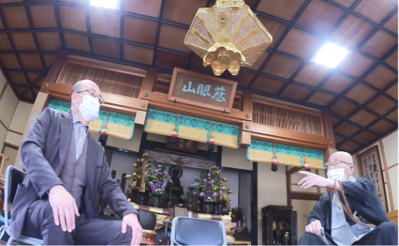 この写真はビデオ取材時のもので、取材場所はお寺の本堂です。