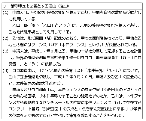 申請書の記載はそれほど難しいものではありませんが「筆界特定を必要とする理由」については、筆界特定を必要とする理由のほかそれまでの経緯も含め詳細に記載する必要があります。