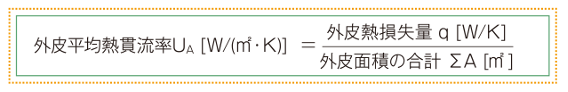 「外皮平均熱貫流率とは」住宅内部の床・外壁・屋根(天井)・開口部から外部へ逃げる熱量を外皮全体で平均した値のことで、単純に言い換えれば「室内からどのくらい熱が逃げるか」を表すUA値のことで、単位はW/㎡Kです。
