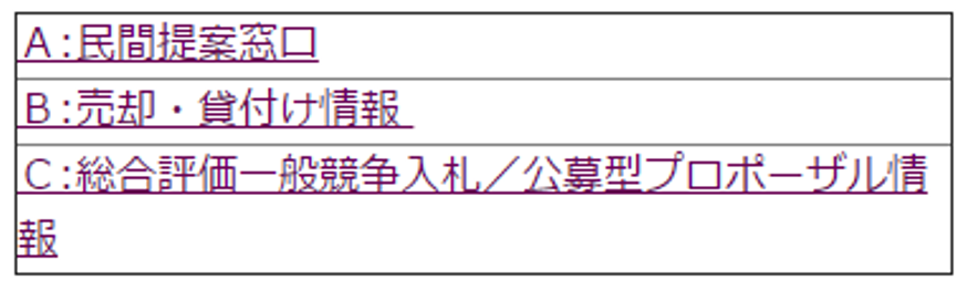一般的に私たち不動産業者が注目すべきはBに分類される「売却・貸付情報」ですが、まれにCに分類される「総合評価一般競争入札/公募型プロポーザル情報」にも興味深い情報が掲載されていますのでチェックしておくと良いでしょう。