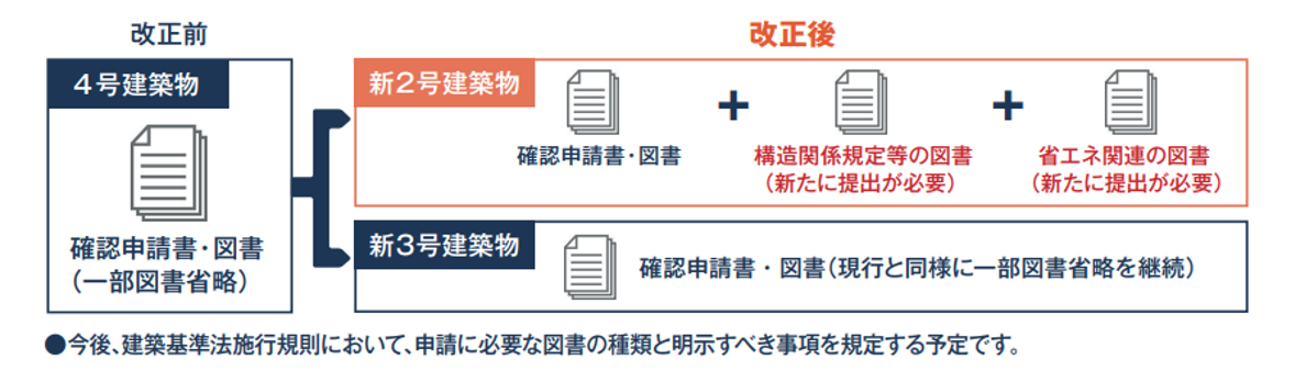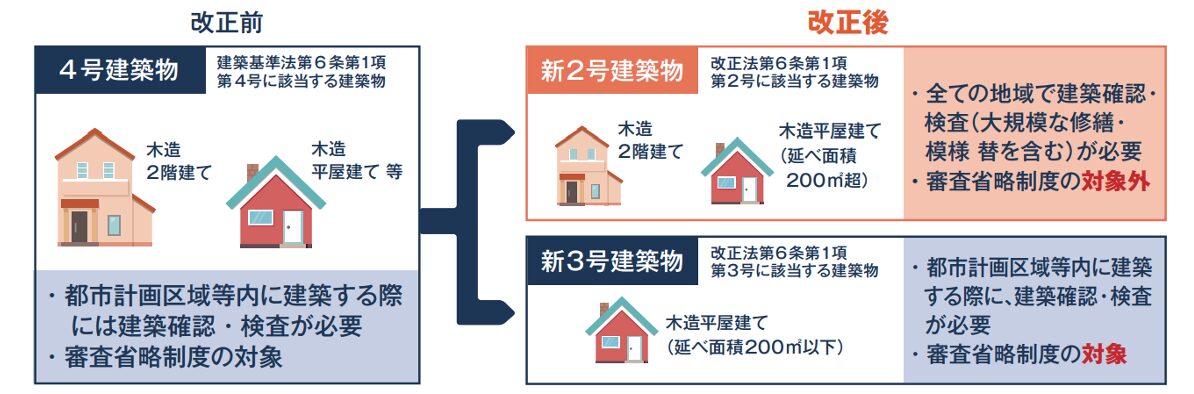 まず基本として覚えておきたいのが、建築基準法改正により従来の「4号建築物」は「新2号建築物」もしくは「新3号建築物」に分類されることです。
