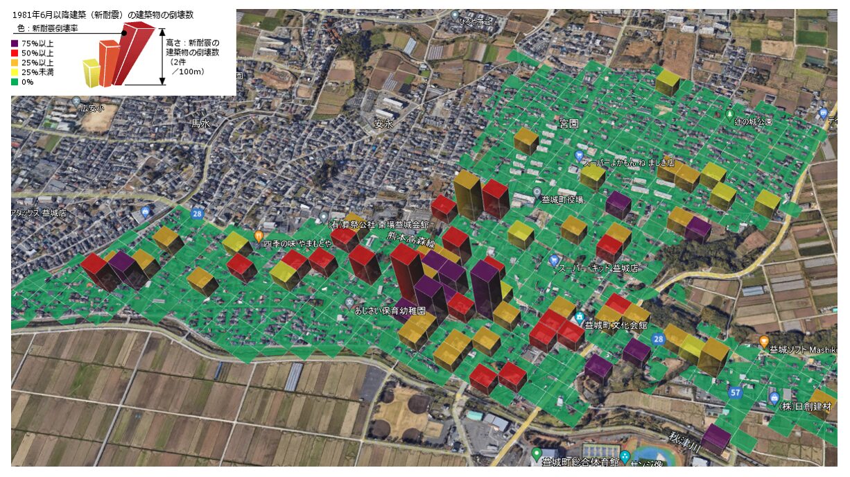 ところが国立研究開発法人研究所他が運営する『都市構造都市化計画』の提供データを見ると、新耐震基準で建築された建物の倒壊を確認できます。