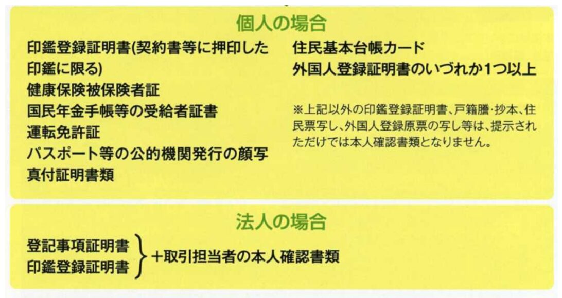 当事者が法人の場合には、法人の登記事項証明・印鑑登録証明を提出してもらうのは当然として、取引担当者の本人確認書類についても、個人取引と同様、従う基準があります。