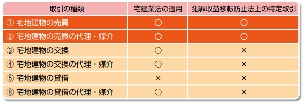 したがって交換や賃貸の媒介については、宅地建物取引業法の適用範囲ではありますが、犯罪収益移転防止法の適用はありません。