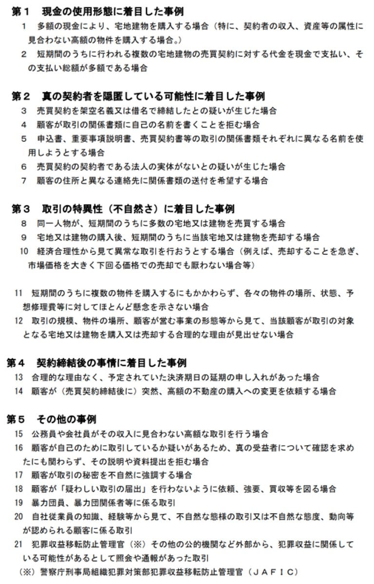 国土交通省は、下記のようなケースは疑わしい取引に該当するとして、報告が義務であるとのバブリックコメントを公表しています。