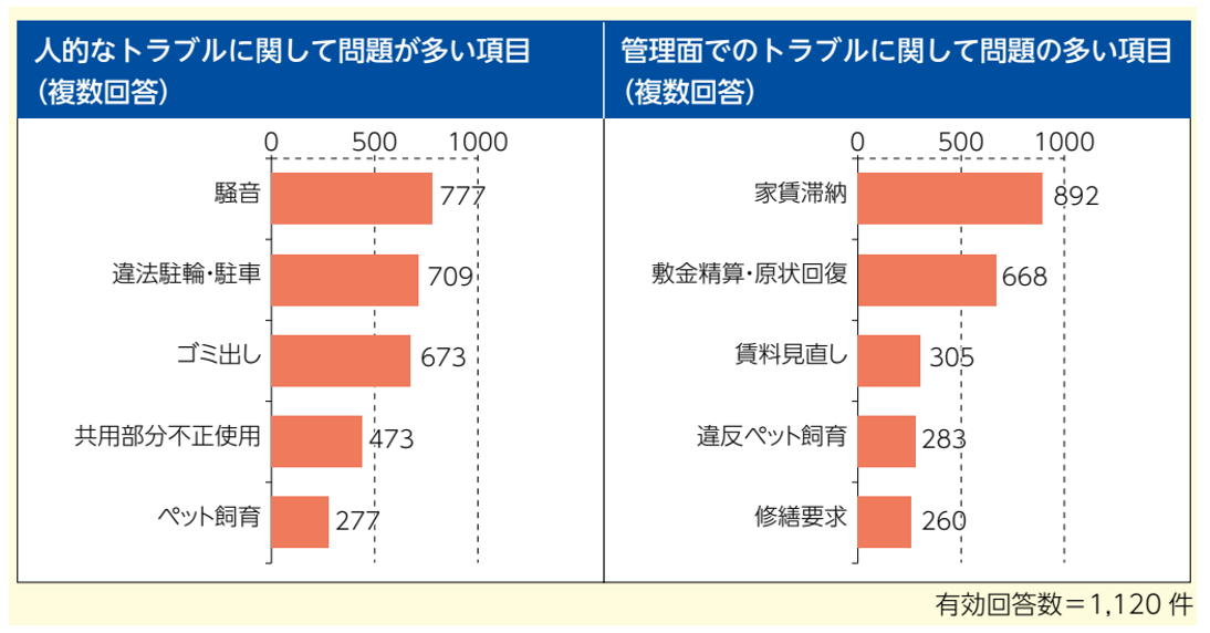 実施に外国人入居者とのトラブル傾向を見ると、騒音、違法駐車・駐輪、ゴミ出しが上位となっており、管理面では家賃滞納、敷金精算・原状回復、賃料見直しの順で多くなっています。