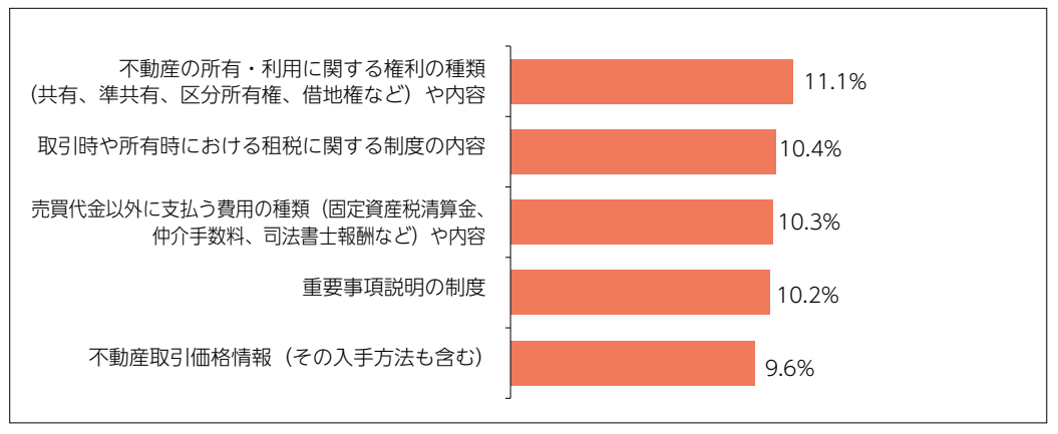 外国人向けに不動産情報サービスを提供する民間企業が実施したアンケート調査結果が、国際対応マニュアルに掲載されています、それを見ると、外国人は説明を受けても、とくに不動産の所有・利用に関する権利の種類(区分所有や借地など)や租税、各種費用のほか重要事項説明について難解だと回答しています。