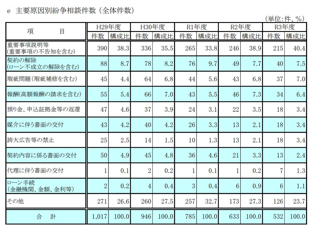 公益社団法人不動産流通推進センターが毎年まとめている「不動産業統計集」を見ても、トラブルの主要原因は重要事項説明が40.4%(R3年)であるとされており、これは例年見られる傾向です。