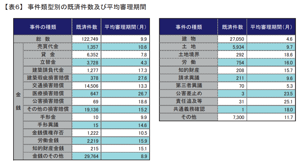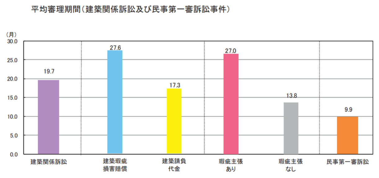 平均審理期間は9.9ヶ月であると先述しましたが、それは立替金(4.3ヶ月)、第三者意義(5.3ヶ月)など、比較的審理期間が短い事件を含めての平均に過ぎません。不動産に関する事件では、建築請負代金(17.3ヶ月)、建築瑕疵損害賠償(27.6ヶ月)、土地境界(18.6ヶ月)など、審理期間が長期化する傾向が見られます。
