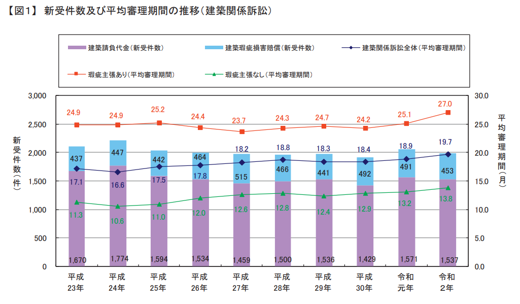 特に建築瑕疵損害賠償事件では、審理期間が2年を超える割合が49.7%と高くなっており、これは立証責任に時間がかかることが一因だと考えられています。