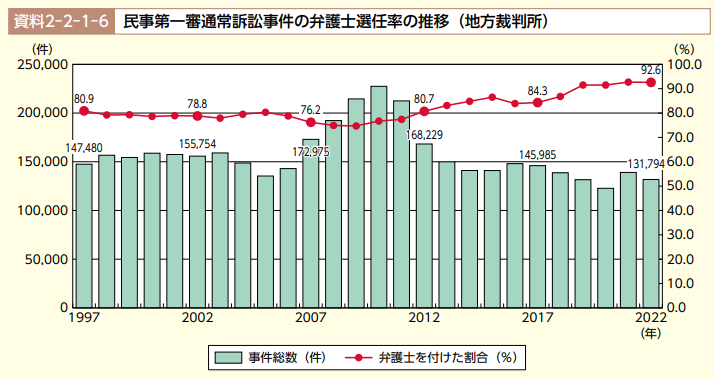 従来、司法試験に合格すれば将来は安泰と言われていましたが、弁護士数が増える一方で、民事第一審通常訴訟事件における弁護士専任率は低下傾向にあります。