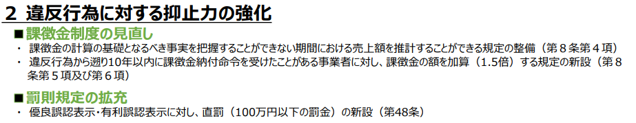 さらに、実際のサービスや商品より優良、もしくは有利であると誤認させるような広告表示を行った事業者に対しては、行政処分を経ずに100万円以下の罰金を科せられる規定が新設されました。