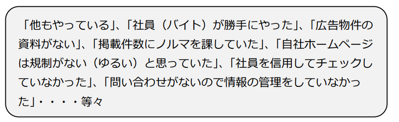 指摘に対し掲載業者は「広告管理を営業マンまかせにしていた」、「広告を担当する別会社に委託していた」といった理由を挙げ、再発防止策として掲載管理システムの導入や物件確認の強化を図ると述べています。しかし、過去に違約金課徴措置を受けているにもかかわらず、再び違反広告を行い、再度措置命令を受けた業者も複数確認されます。