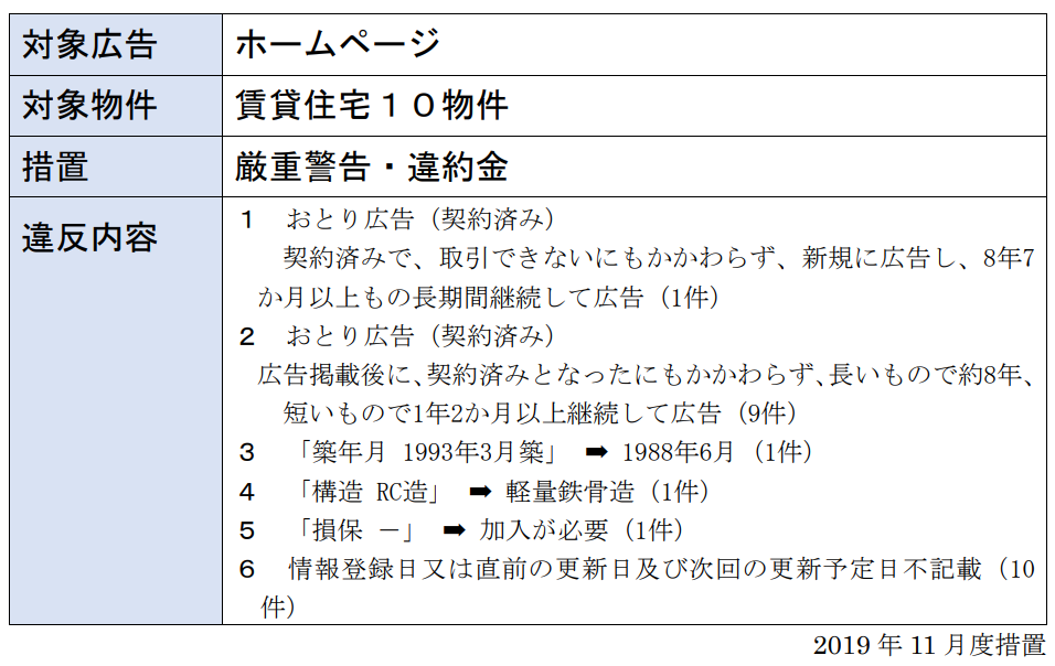 中には、取引ができない状態の物件を3年3ヶ月以上継続して掲載し続け、敷金や損害保険料などの償却費を表示していなかった業者もありました。この業者は「物件カタログのつもりだった」と答弁したと記述されていますが、次いで聴取担当のコメントとして「長年、事情聴取を行ってきたが、このような答弁は初めて聞いた」と記載されているのを見て、筆者も苦笑を禁じえませんでした。