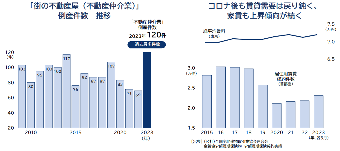 一方で、帝国データバンクは2024年3月2日に、賃貸マンションやアパートの仲介・管理を手掛ける「街の不動産屋」の倒産件数が急増したと報じています。具体的には2023年倒産件数は120件、前年(69件)対比で7割増、この倒産件数は過去最高でした。