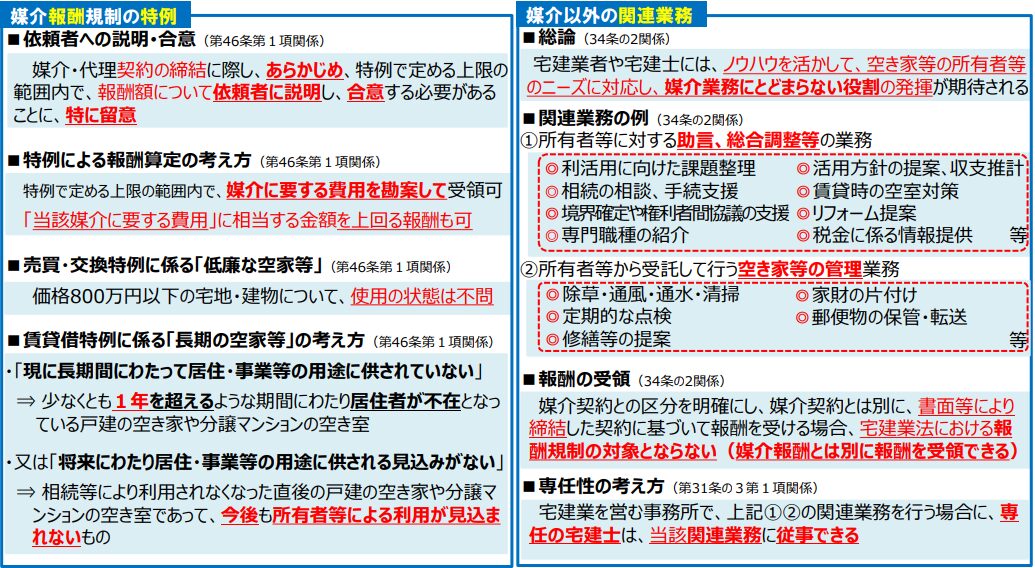 これにより、課題整理や利活用方針の作成、助言、建物管理業務など、依頼者から求められた業務に対応した場合、コンサルタント報酬を受領できることが周知されました。媒介業務と不動産コンサルタント業務は別ですから、従前でも報酬を得ることが問題とはされませんでした。しかし、国土交通省が明言したことで、広く知れ渡る結果となったのです。