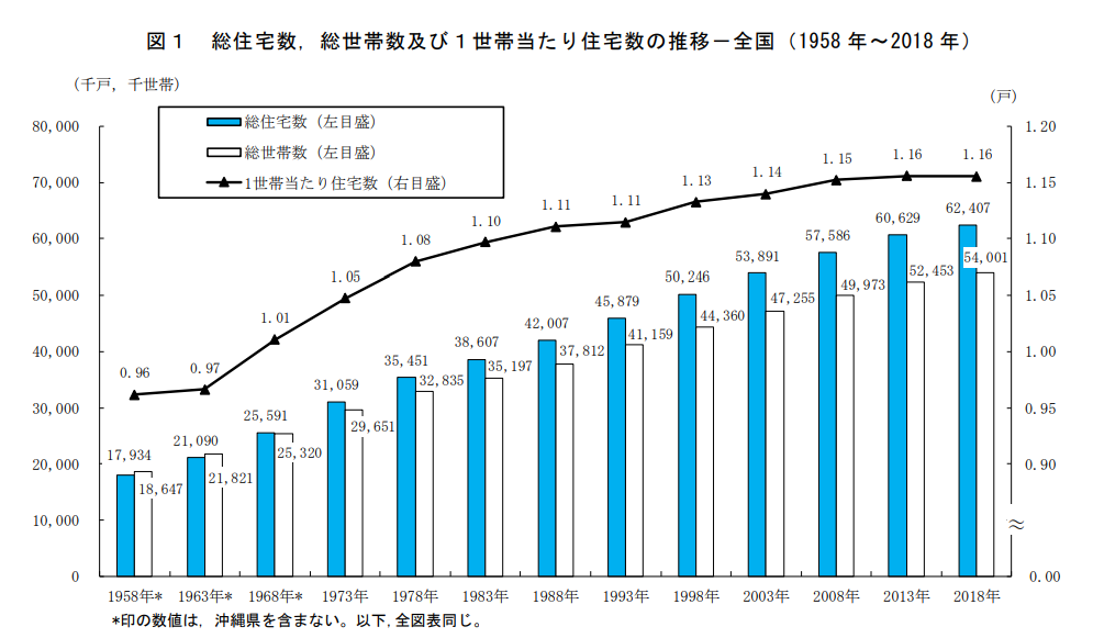 総務省統計局が令和元年に公開したデータによると、1968年に総世帯数が住宅数を下回り、それ以降は住宅数が世帯数を上回る状態(2018年には1.16戸)となっています。