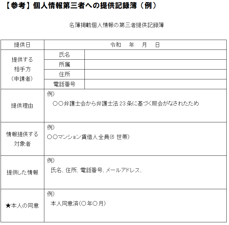 なお、個人データの取得や提供記録の作成・保存は、個人情報保護法で義務付けられていますが、その様式については法律やガイドラインで特に指定されていません。自由形式で記録しても構いませんが、後々トラブルが発生した際には、この提供記録が疎明書類となるため、提供記録簿を参考に漏れなく記録することが重要です。