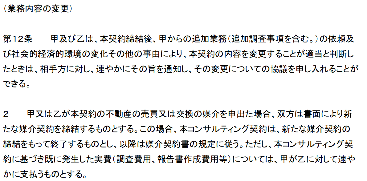 また、コンサルティング業務を受任する際には、不動産コンサルティング業務委託契約書の締結は必須ですが、契約書の約款に媒介契約への変更に関する条項(例 第2項)を盛り込んでおくのも一つの方法です。