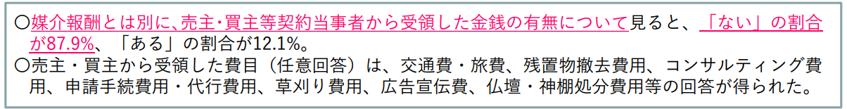 実際に宅地建物取引業者に対するアンケート調査でも、媒介業務以外の関連業務として報酬を受領できたケースは、残置物の撤去や廃棄物処理、畳交換や草刈りなどの実費請求を除けば、補助金の手続き代行に関する事例が見られる程度です。