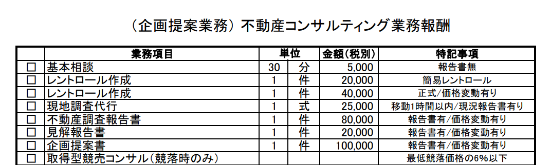 しかし、目安がないことで、提案する業務内容と報酬額が妥当なのかの判断が難しくなります。そのため、インターネットで他社の不動産コンサルティング報酬を調査し、あらかじめ独自の価格表を作成しておくと良いでしょう。