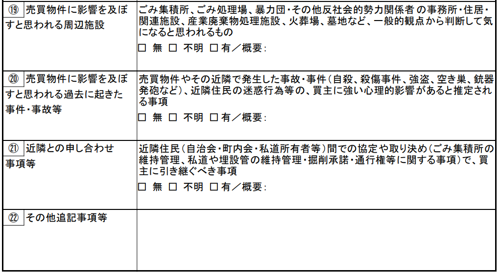 また、物件状況報告書の「売買物件に影響を及ぼすと思われる周辺施設」や「その他追記事項等」の欄に、悪臭の発生頻度や程度を正確に記載するよう、売主に促す必要があります。