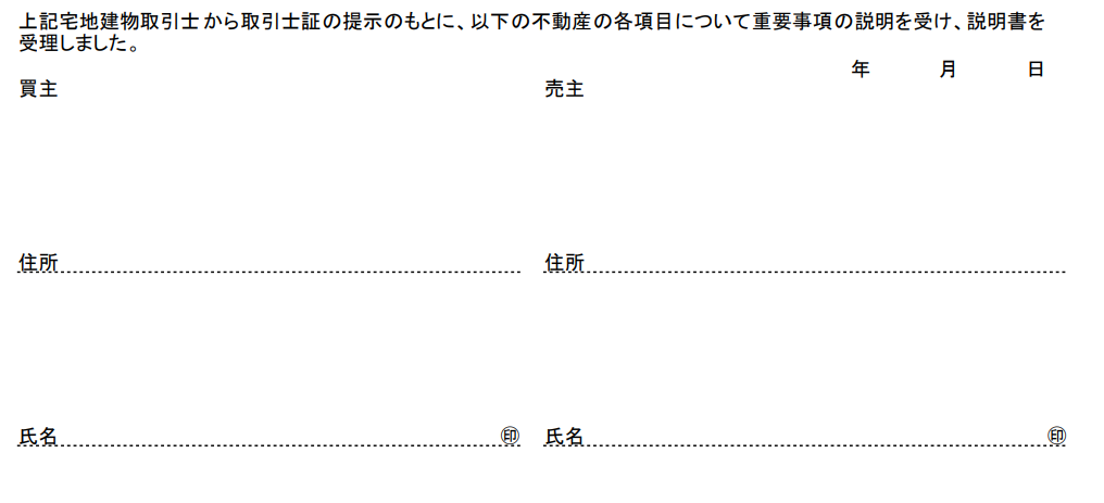 なお、重要事項説明は購入者に対して行うことが義務付けられていますが、売主に対して説明する法的な義務はありません。ただし、書式には売主の署名捺印欄が設けられ、実務上も売主に記載内容を確認してもらうことが推奨されています。これは購入者への説明の前提として、売主の同意を得ることで取引の透明性を確保するためです。
