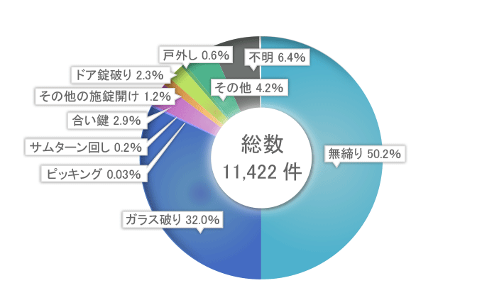 侵入手口は、一戸建て住宅、共同住宅ともに無施錠、ガラス破り、合鍵の悪用が多いとされています。そのため、普段から出入口や窓を確実に施錠する習慣を身につけることが、防犯対策の第一歩となります。