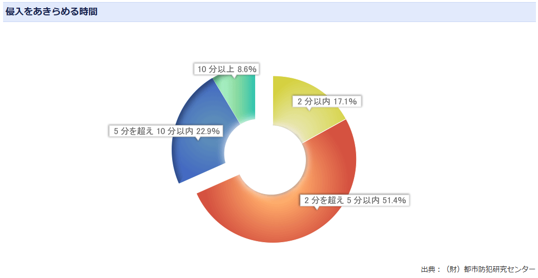 財団法人都市防犯研究センターの資料によると、空き巣の約7割は、5分以内に侵入できない場合に犯行を断念するというデータがあります。