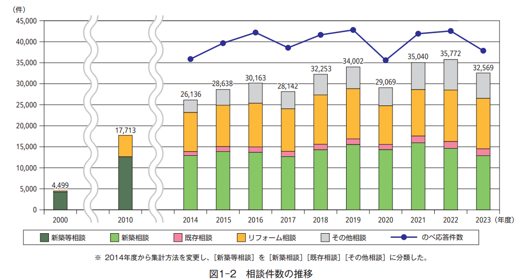 住宅相談統計年報2024年版によると、住宅リフォームに関する相談件数は2016年に1万件を超え、2022年以降では12,000件以上が寄せられています。