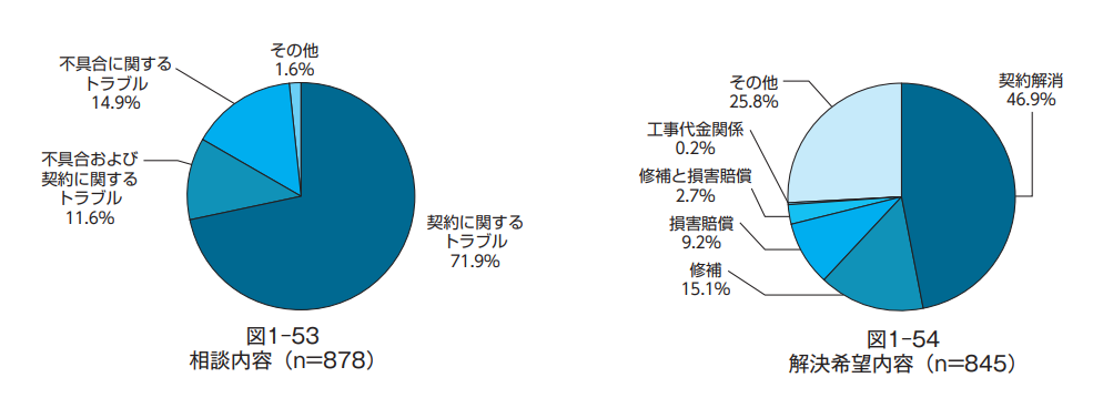 そのうち、46.9%のケースで契約解消が希望されており、多くの場合、「見積もり代金が不当に高額な契約を締結させられた」、「不必要な工事を契約させられた」ことが理由です。