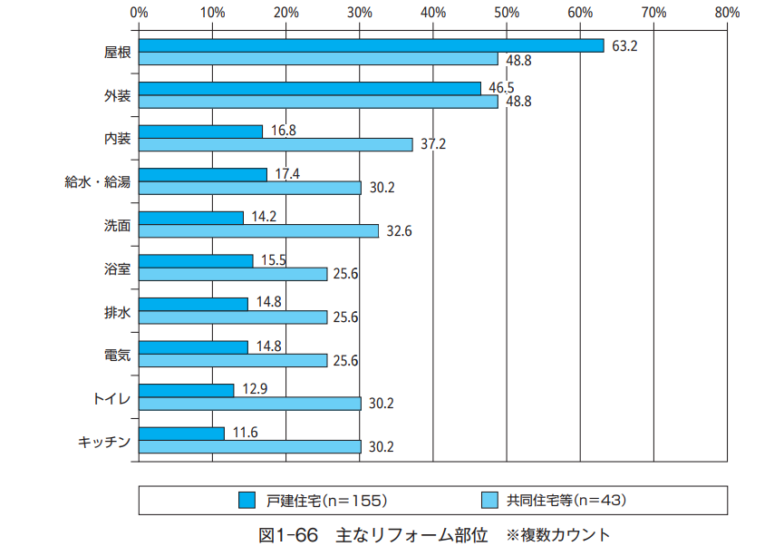 相談が多いリフォーム箇所は屋根や外壁ですが、住設機器全般の相談も見受けられます。