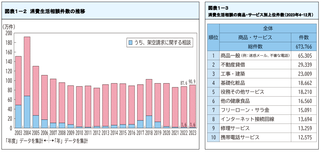 令和6年版消費者白書による消費生活相談件数の推移を確認すると、相談件数自体は減少傾向にあるものの、商品・サービス別のランキングでは「商品一般」に次いで「不動産賃貸」に関する相談が上位を占めています。また、年代別に見ると、20代からの相談件数が他の年齢層を大きく上回っています。