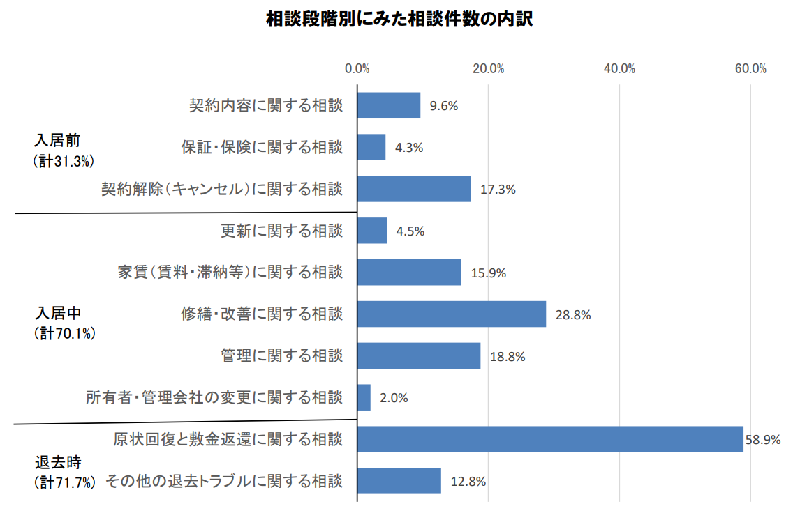 相談内容を段階別に分類すると、入居中は修繕や管理に関する相談が多く、退去時には「原状回復費用と敷金返還に関する相談」に関するトラブルが突出しています。