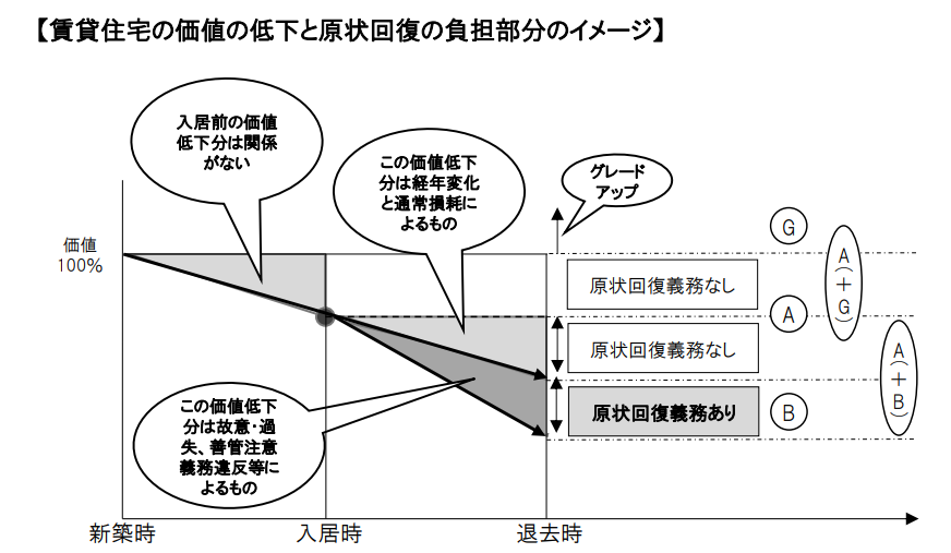 この資料では、賃貸住宅の低下と原状回復の負担について具体的に記載されており、設備の経過年数(種別ごと、具体的な耐用年数の資料も提示されています)と賃借人の負担割合が示されています。本来であれば、このような基準が普及することで原状回復トラブルは減少するはずですが、実際には増加傾向にあります。