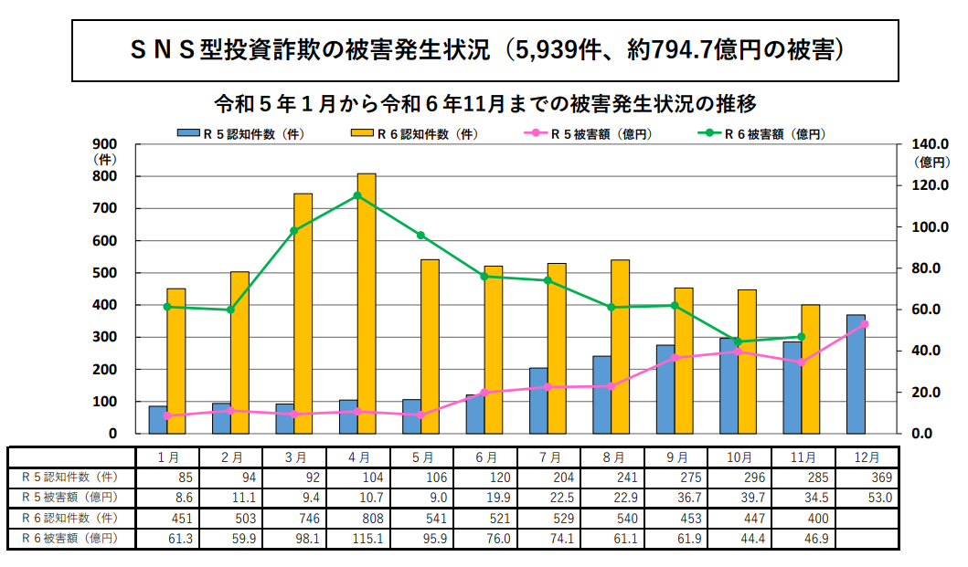 さらに、令和5年1月から令和6年11月までの「SNS型投資詐欺」に関する被害認知件数は5,939件、被害総額は約797.4億円であることも確認できます。