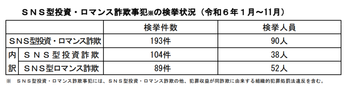 しかし、このような多くの認知件数に対して、「SNS型投資詐欺・ロマンス詐欺」の検挙件数は令和6年1~11月でわずか193件に留まっています。