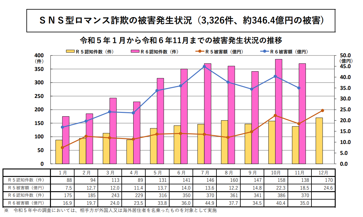 SNSをきっかけに恋愛関係が始まることは珍しいことではありません。むしろ現代で最も多い出会い方の一つかも知れません。しかし、SNS型ロマンス詐欺が、令和5年1月から令和6年11月までの累積件数で3,326件、被害総額が約346.4億円に達している実態を知れば、危険性が良く分かります。