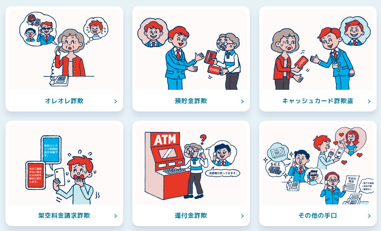 オレオレ詐欺、預貯金詐欺、還付金詐欺などが典型的な例です。
